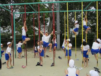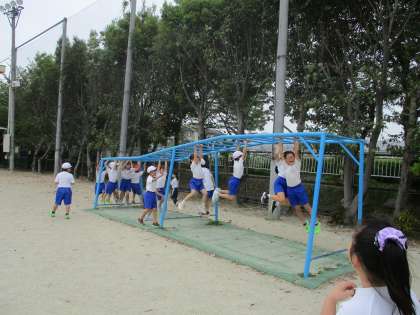 体育の時間に、ゆうぐの使い方(3点支持など)を学習しています。2年生になって、先生が見ている前では、ジャングルジムは2階まで使えるようになりました。安全に楽しく遊びましょう。雲梯や登り棒なども、たくさん挑戦する姿が見られました。