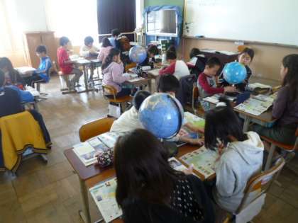 地球儀を前に、楽しそうにいろいろな国を探していました。