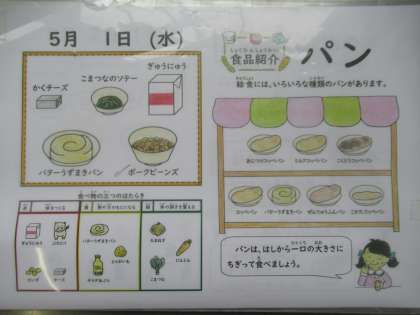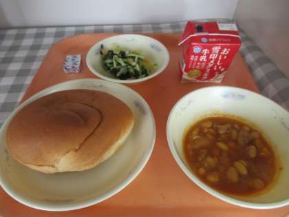 バターうずまきパン、牛乳、ポークビーンズ、小松菜のソテー、チーズ