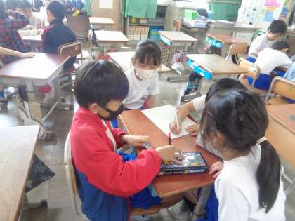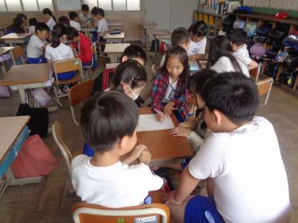 憲法集会の後、クラスで増やしたい、いい言葉を考えたり、人権標語について話し合って決めたりしました。クラスで増やしたい、いい言葉はグループで話し合ったあと、全体で共有しました。ありがとうや頑張ろうなど嬉しい言葉が子どもたちからたくさん出てきました。
