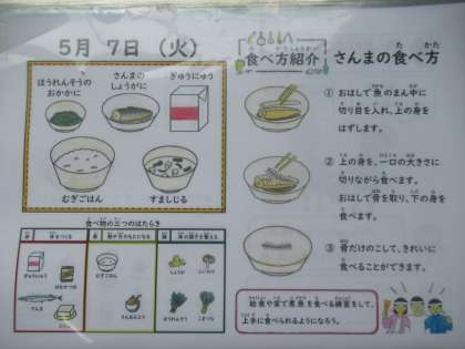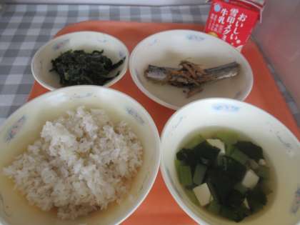 麦ごはん、牛乳、さんまのしょうが煮、ほうれん草のおかか煮、すまし汁