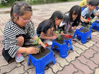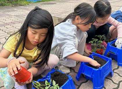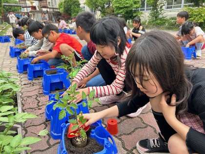 生活科では「ぐんぐんそだておいしいやさい」の学習をしています。1年生のときは植物を育てましたが、2年生では野菜を育てていきます。今日は、一人ひとりの鉢に、ふかふかの土のベッドをしき、ミニトマトの苗を植えました。子どもたちは、「早く大きくなってね。」「おいしくなあれ。」という気持ちで水やりをがんばりたいと話していました。
