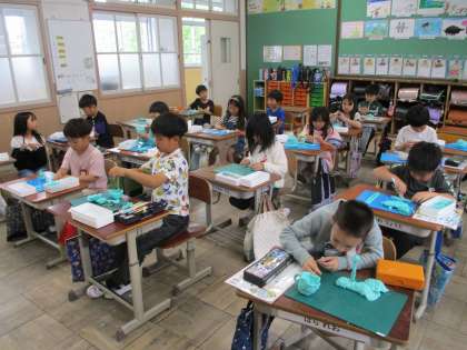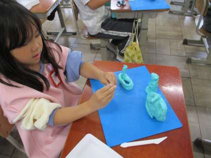 図画工作科「にぎにぎねん土」の様子です。粘土をにぎって、面白い形をたくさん作ることができました。