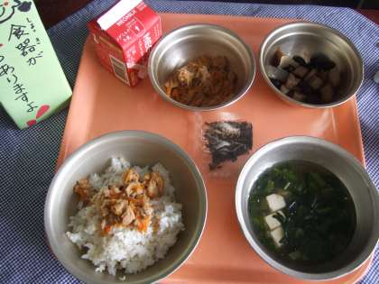 そぼろどんぶりの具は、しょうが・たまねぎ・にんじん・しいたけ・まぐろフレークをいため、甘辛く味付けしました。 きざみのりとともに、ごはんにのせて食べるので、ごはんがすすんだようです。