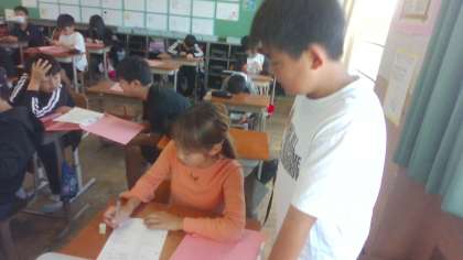 朝学習で、算数の基礎プリントに取り組んでいます。早く終わった人が友達に、やさしくアドバイスする姿がありました。