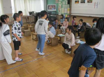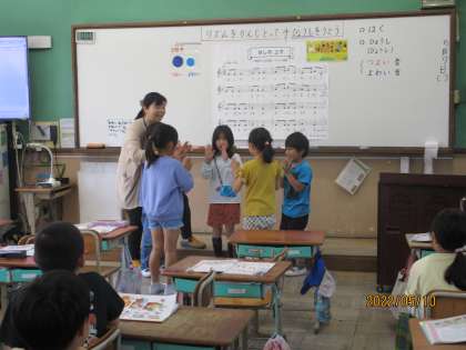 2組の音楽の様子です。「音楽でみんなとつながろう」の学習では、世界の遊びを楽しく遊びながら歌いました♪