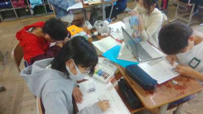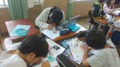 修学旅行の振り返りをしました。学んだことを班でパンフレットにまとめていきます。