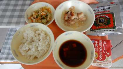 麦ごはん、牛乳、鶏肉のてり焼き、キャベツの煮つけ、赤だし