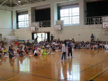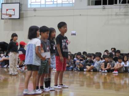 1年生を迎える会がありました。2年生からは、「ひらがなのクイズ」やポケモンのダンス♪、あさがおの種のプレゼントなどで、お祝いの気持ちを伝えました。大きな声で、全力で頑張ることができました。1年生と、これからも仲良く協力して、学校生活を楽しんでほしいと思います。