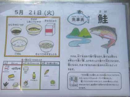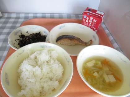 ごはん、牛乳、さけの塩こうじ焼き、ひじきの煮つけ、キャベツのすまし汁