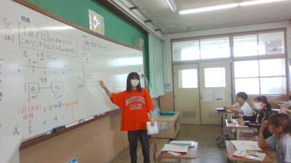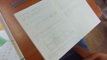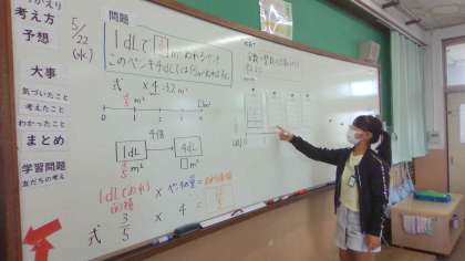 分数×整数の計算の仕方を、図を使って考えました。考えたり交流したりしたことを、一生懸命みんなの前で説明する姿がありました。
