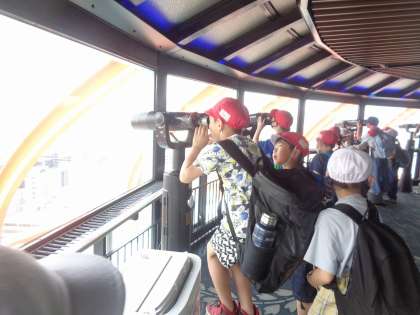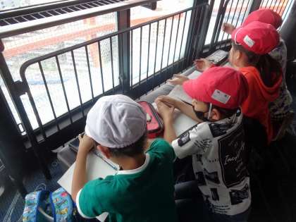 社会見学で京都駅の周りの様子を見たり、京都タワーに上って京都市の様子を見たりしました。お天気も良く、京都タワーからは、遠くの山や大きな道路、寺院など色々なものを見つけて友達と話しながらノートにメモをする姿もありました。また、お昼は梅小路公園でお弁当を食べました。班で仲良く、とてもうれしそうにお弁当を食べていました。