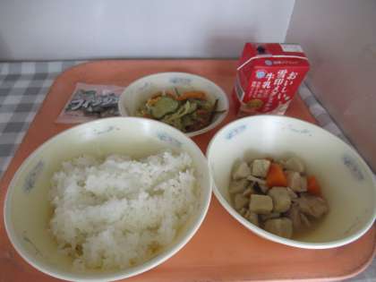 ごはん、牛乳、高野どうふと野菜のたき合わせ、ごま酢煮、じゃこ