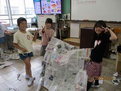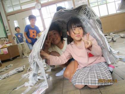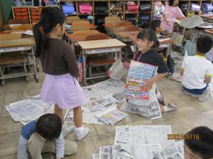 お気に入りのものを作れて、新聞紙ととってもなかよくなれました♪活動のあとは、みんなで素早くお片付けをがんばりました。