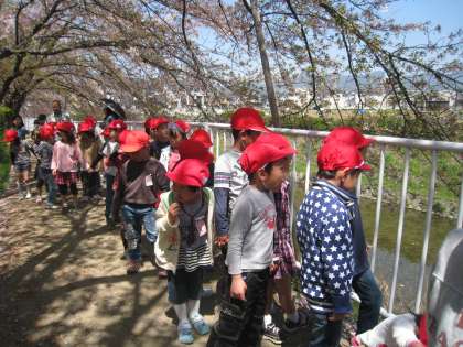 1年生は有栖川の周りを散歩しに行きました。有栖川沿いに咲く、なのはなやぺんぺん草を見て「きれーい」「せんせい、みてみてー」とうれしそうに声を挙げている子、川の中にいる鯉や鴨の様子をじーっと見ている子と、みんな楽しそうに春を満喫していました。