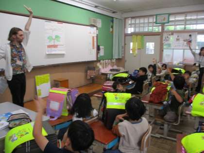 帰りの会の時間に、アンディ先生が遊びに来てくれました。