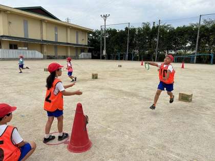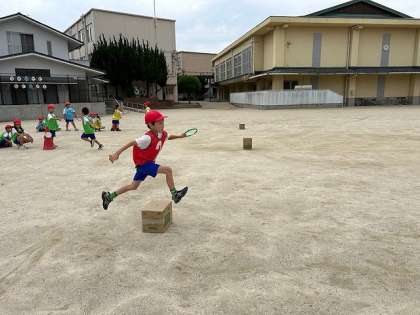 慣れてきたので、ぴょんぴょんリレーも始めました。次は箱を飛び越えます。置く場所を自分たちで工夫するときに、どうやったらチームの皆がとび越しやすいかをよく考えていて、友達を思いやる気持ちがキラッキラでした☆彡