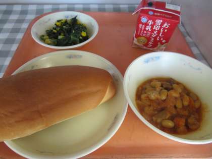 味つけコッペパン、牛乳、ポークビーンズ、ほうれん草のソテー