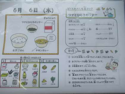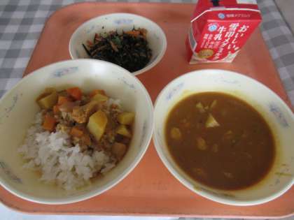 麦ごはん、牛乳、チキンカレー、ツナとひじきのソテー