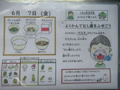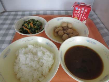 ごはん、牛乳、鶏肉のさっぱり煮、だいこん葉のごまいため、赤だし