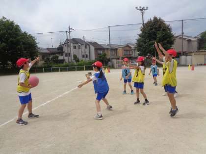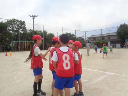 チームで動き方やパスを工夫しエンドボールの学習を楽しんでいます。前半、後半の間にはチームで作戦を立てていました。