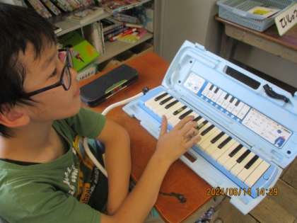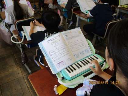 けんばんハーモニカを使ってリズムを確認しました。一つ一つの音符を確認しながら、演奏をしていました。