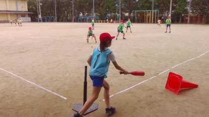 体育の「ベースボール」では、ティの上に置いたボールを打ちます。