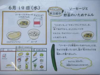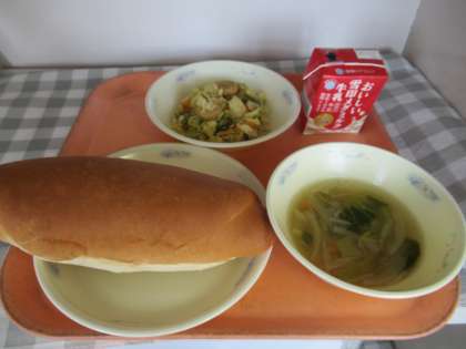 ミルクコッペパン、牛乳、ソーセージと野菜のいためナムル、スープ