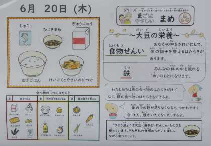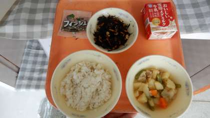 麦ごはん、牛乳、鶏肉と野菜の煮つけ、ひじき豆、じゃこ