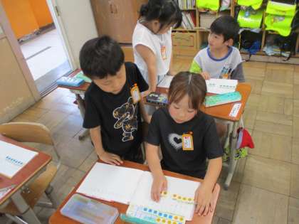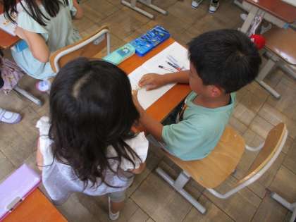 数図ブロックの動かし方を2人組で確かめ合って、「できたね。」「上手だよ。」など、お互いに声をかけ合って学習を進める1年生です♪