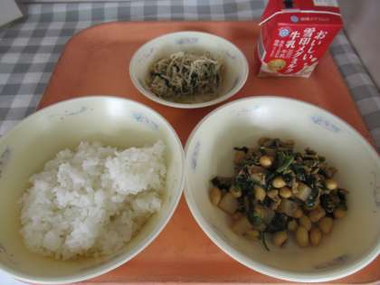 ごはん、牛乳、肉みそいため、もやしのごま煮