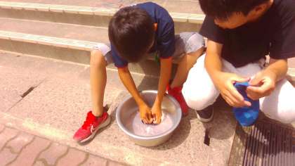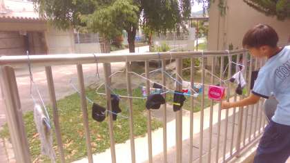 家庭科の学習で、手洗いで洗濯をする実習をしました。手洗いの良さを感じながら取り組むことができました。洗い方や干し方の工夫を生活の中でも生かしてほしいと思います。