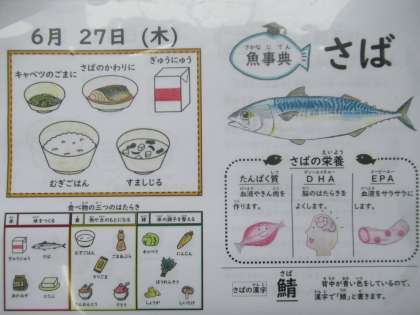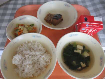 麦ごはん、牛乳、さばのかわり煮、キャベツのごま煮、すまし汁