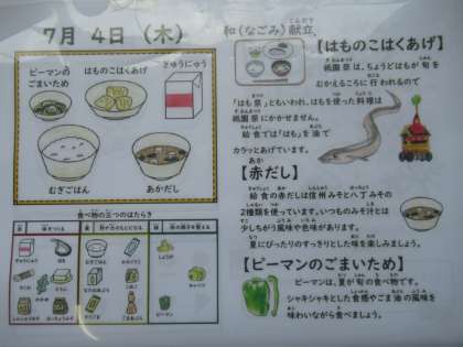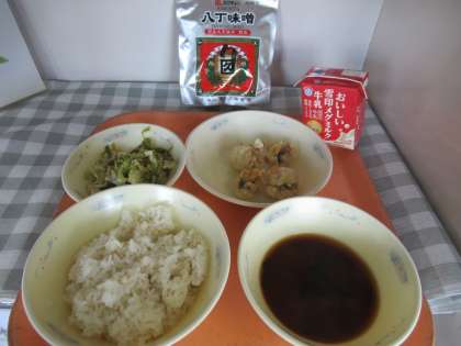 麦ごはん、牛乳、はものこはくあげ、ピーマンのごまいため、赤だし