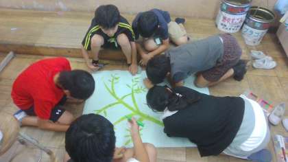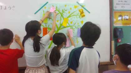 七夕がもうすぐだということで、子どもたちから願い事の短冊を書きたいとリクエストがありました。本物の笹がないのでみんなで絵を描いてそこに願い事の短冊を貼りました。みんなの願いが叶いますように〜☆