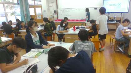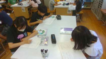メダカが何を食べて生きているのかを考えました。水中の生き物を顕微鏡で観察し、カードにまとめました。