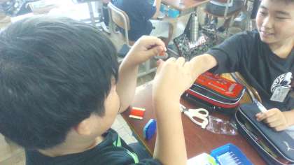 裁縫の学習のスタートは、基本となる「玉結び、玉どめ」の練習です。今日は、「玉結び」の練習をしました。友達と見せ合い、教え合いながら挑戦していました。
