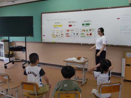 栄養教諭の野里常先生から、元気に過ごすひみつについて教えてもらいました。紙芝居で赤・黄・緑色の食品の働きを知り、釣りゲームをして給食の食品を3つのグループに仲間分けしました。給食にはどの色の食品も使われていることに気付くことができました。