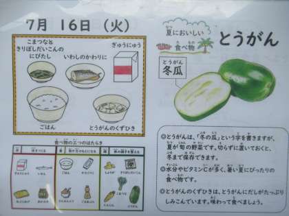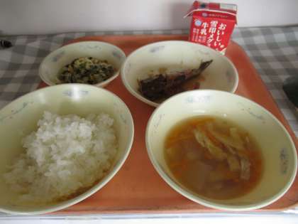 ごはん、牛乳、いわしのかわり煮、小松菜と切干大根の煮びたし、とうがんのくずひき