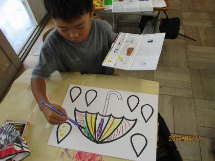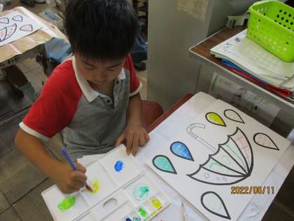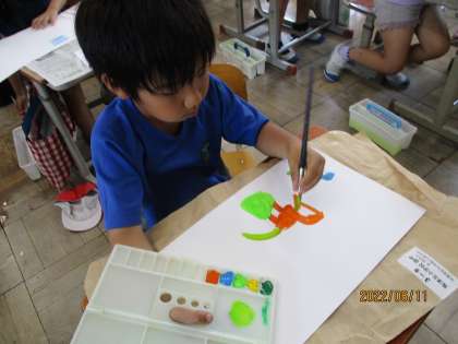 絵の具セットに入っている道具の名前を覚えたり、筆や筆洗バケツ、パレットなどの使い方を学んだりしました。