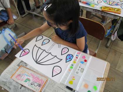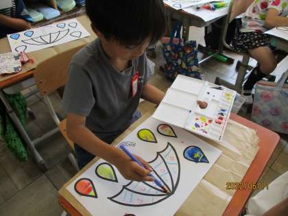 選んだ色と色を混ぜ合わせることで、「どんな色になるかな」とワクワクしながら活動していました。最後にオリジナルの傘づくりも楽しむことができました。