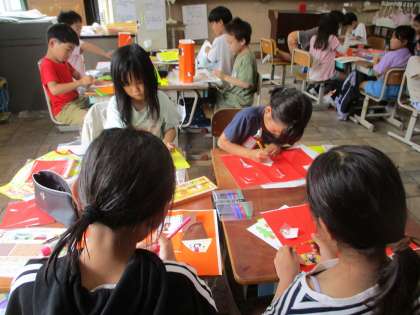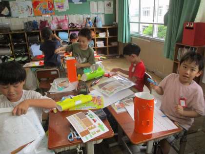 窓の周りの飾りつけも考えました。友達と一緒に作品を見せ合いながら活動する中で、「いいな。」と思うところを自分の作品に取り入れながら、頑張っていました。