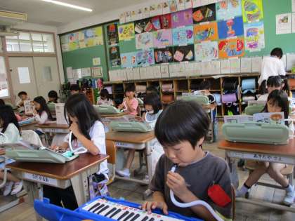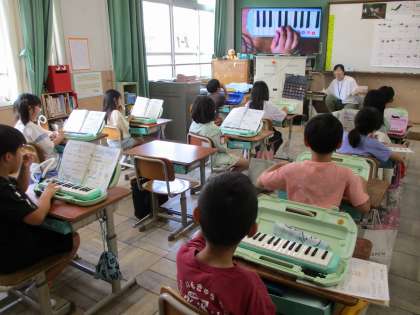 音楽の学習では、鍵盤ハーモニカで「かっこう」の演奏が上手にできるようになったり、旋律あそびをしたりしてきました。そして今は、身の回りで聴こえる鳴き声を、グループの友達に伝え合う活動をしています。「ケロッケロッ」「ニャーニャー」など、友達と声を合わせたり、追いかけっこをしたりしながら、楽しんでいます。