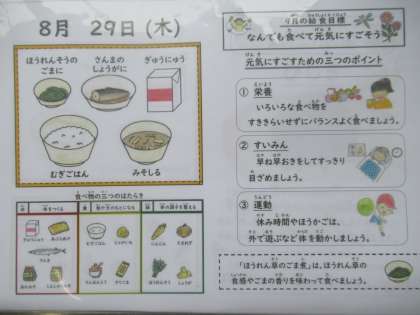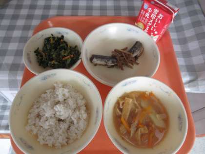 麦ごはん、牛乳、さんまのしょうが煮、ほうれん草のごま煮、みそ汁