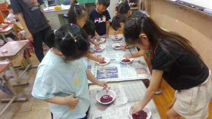 これまで大切に育ててきたあさがおの花をつかって、和紙を染めました。