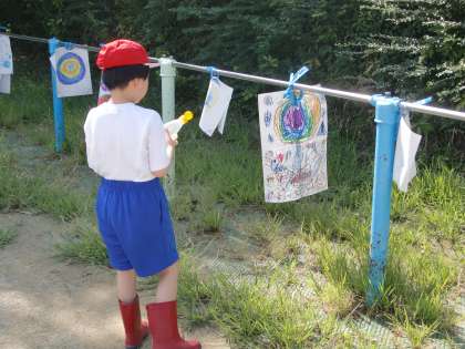 生活科”なつとともだち”の学習で交流学級の友達と一緒に水あそびをしました。空き容器に水を入れて、的を狙って水を飛ばしたり、地面に絵を描いたりして楽しみました。