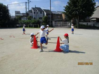 いろいろな遊び方を知り、リズムよく跳んだり、高く跳んだりして楽しんでします。