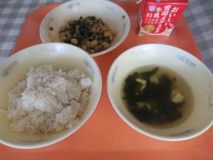 麦ごはん、牛乳、肉みそいため、すまし汁