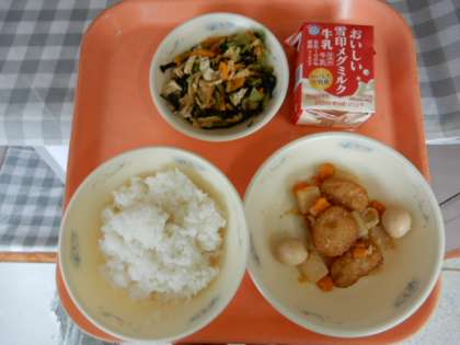 ごはん、牛乳、平天とこんにゃくの煮つけ、小松菜の煮びたし