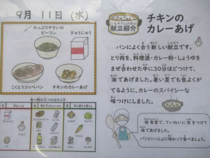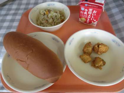 黒糖コッペパン、牛乳、チキンのカレーあげ、たっぷり野菜のビーフン